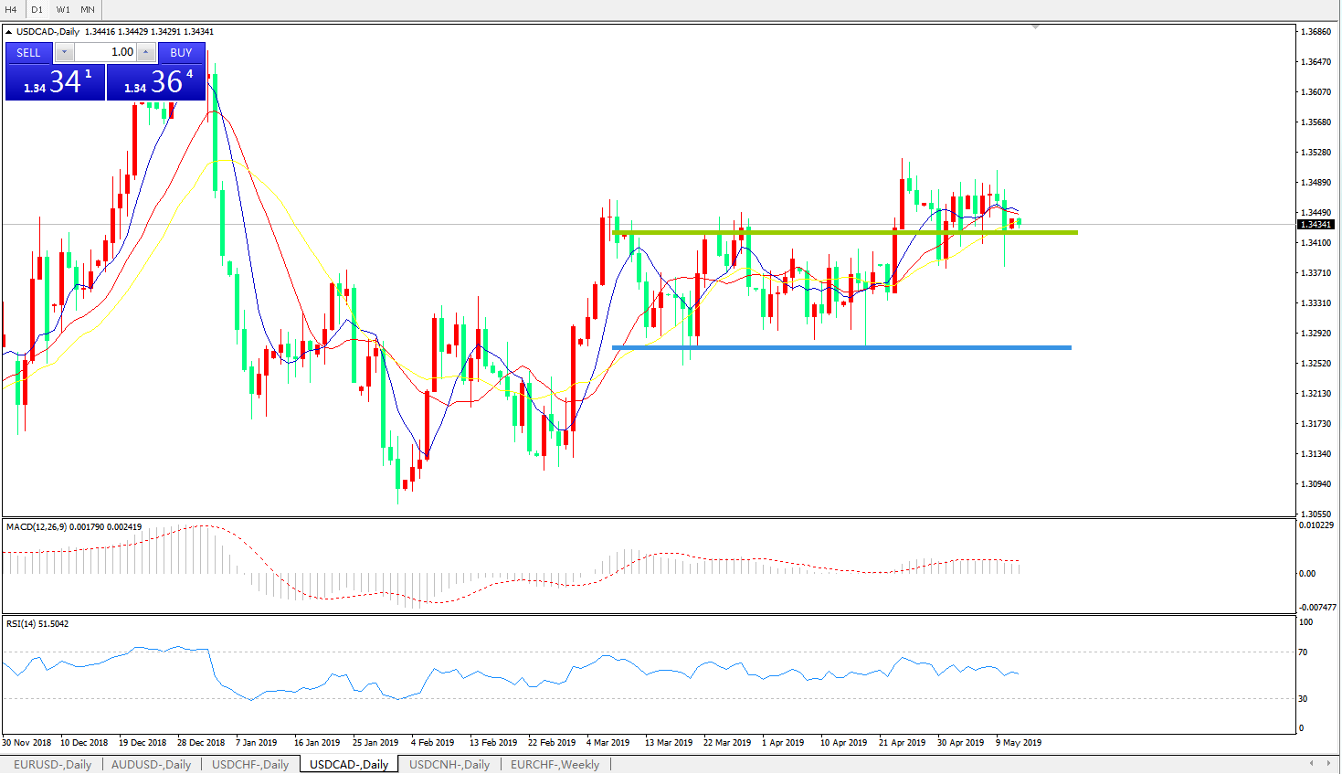 周五公布的美国CPI数据不及预期,同时加拿大方面4月失业率好于预期且该国4月就业人数变动新增10.65万人,为加拿大录得纪录最高月度就业增长。美元兑加元短线急跌逾70点,报1.3388,刷新7个交易日低位。总体而言,美元兑加元仍维持在上升趋势线上方。随着近期美元对于加拿大经济数据的敏感程度有所上升,如果加拿大经济数据进一步好转,可能会使得美元兑加元进一步承压,如果未来几个交易日仍承压于1.3425/50下方,料美元兑加元将进一步回落。