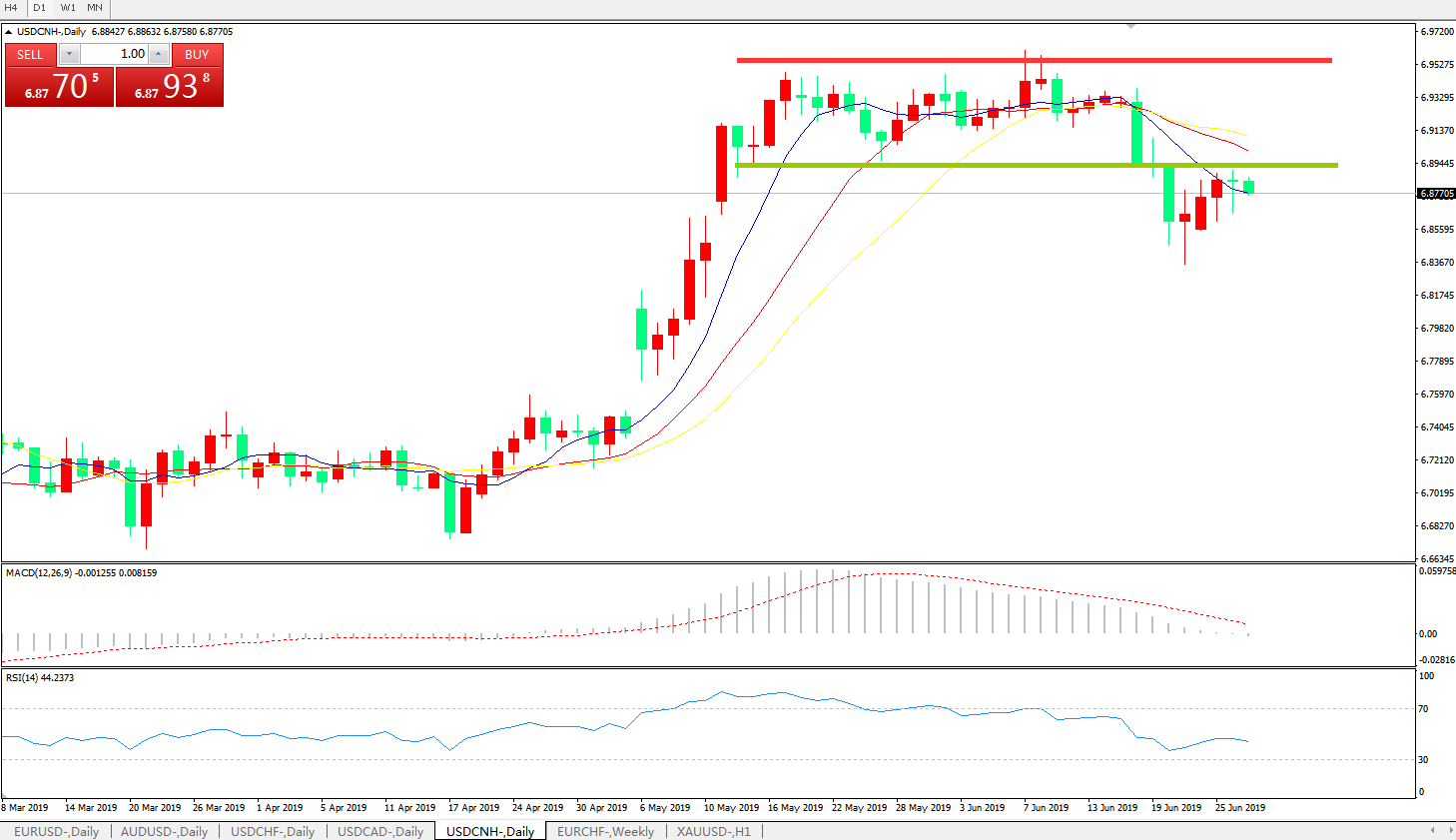 技术面简析:日线图呈有序空头排列,MACD逼近0轴且动能柱绿柱放量,RSI开始反弹后再度走弱,贸易争端缓解预期犹在,G20临近,预计汇价大概率将进一步走低。