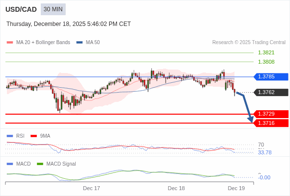 美元/加元 当日内 : 看跌,在 1.3785 之下。