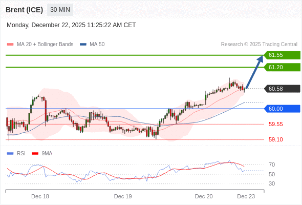 在 60.00 之上,看涨,目标价位为 61.20 ,然后为 61.55 。