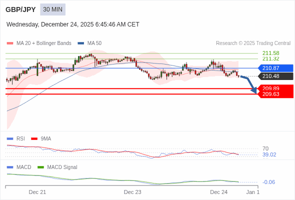 英镑/日元 当日内 : 看跌,在 210.87 之下。