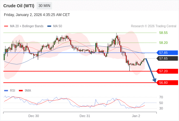 在 57.85 之下,看跌,目标价位为 57.20 ,然后为 56.80 。