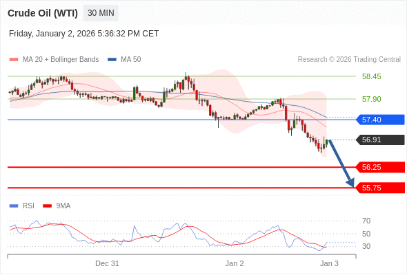 在 57.40 之下,看跌,目标价位为 56.25 ,然后为 55.75 。