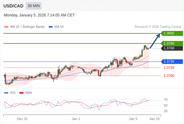 在 1.3735 之上,看涨,目标价位为 1.3780 ,然后为 1.3805 。