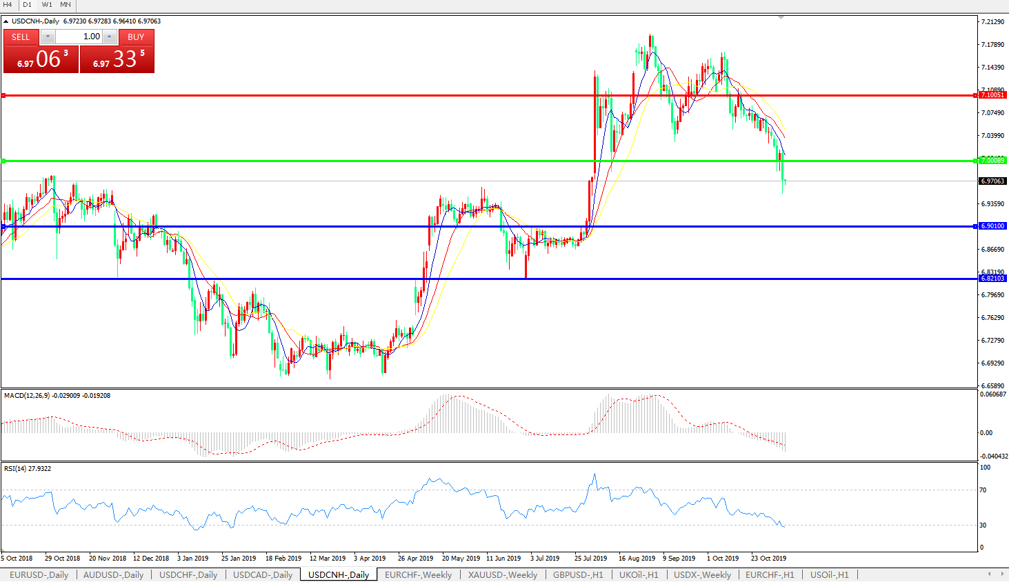 交易策略: 在7.0000之下,看跌,目标价位为6.9010,然后为6.8210。
