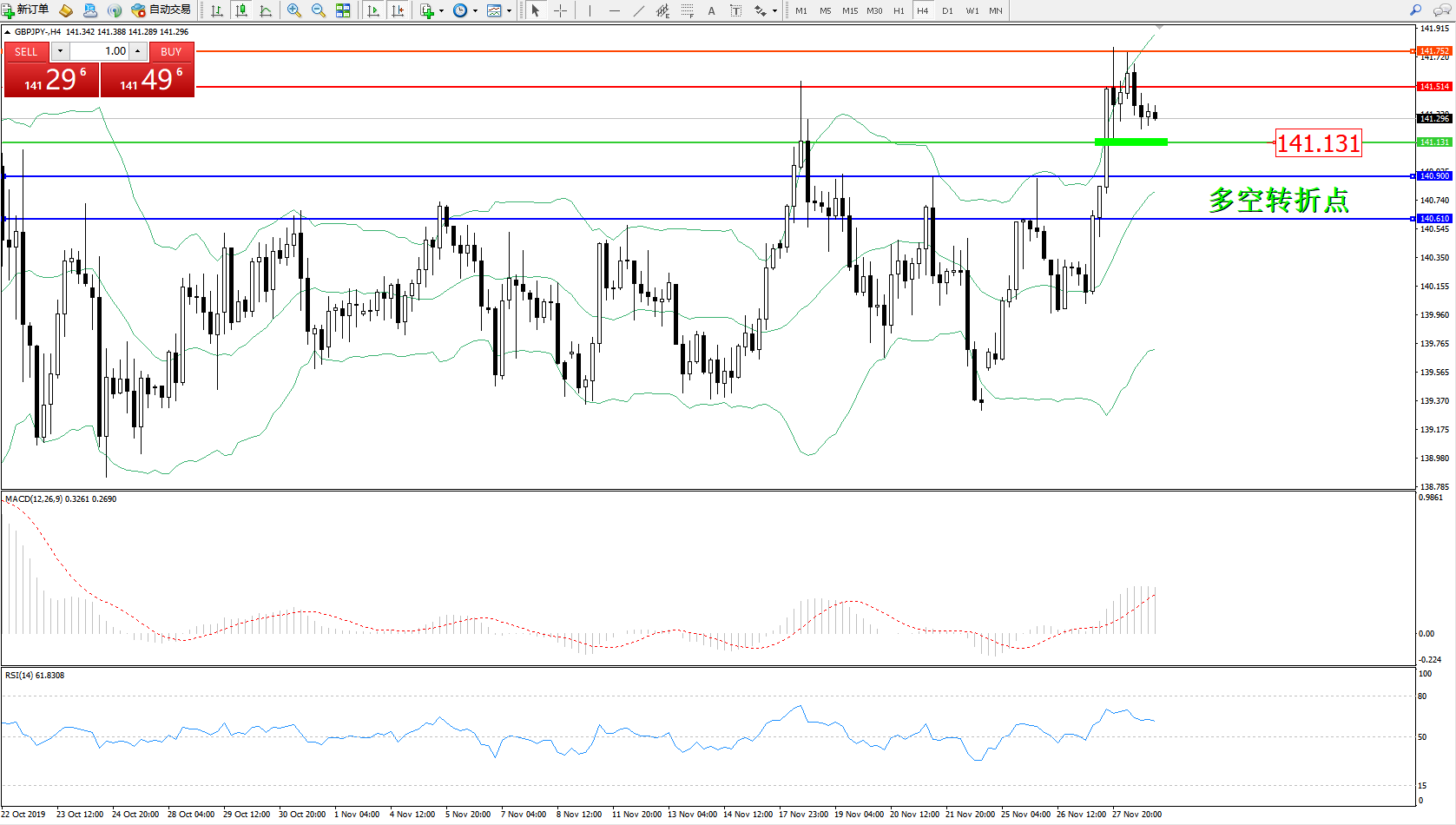 交易策略:141.131上方看涨,目标141.514141.752