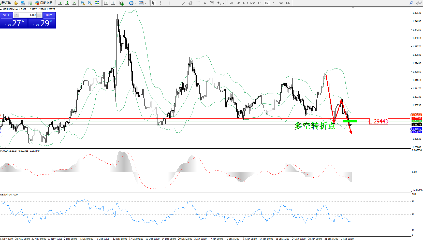 交易策略:1.29443下方看跌,目标1.29050、1.28877