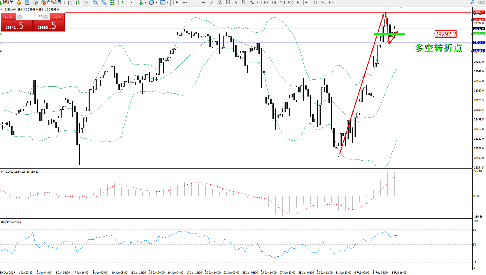 交易策略:29292上方看涨,目标29421、29492