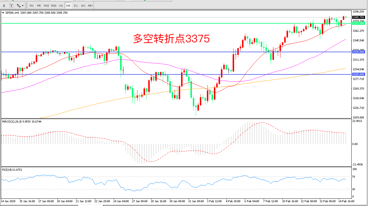 4小时图看,标普500阳线连续拉萨,整体处于多头形态之中,均线系统呈多头排列,MACD红柱增加,RSI指标走平,日内延续震荡概率较大