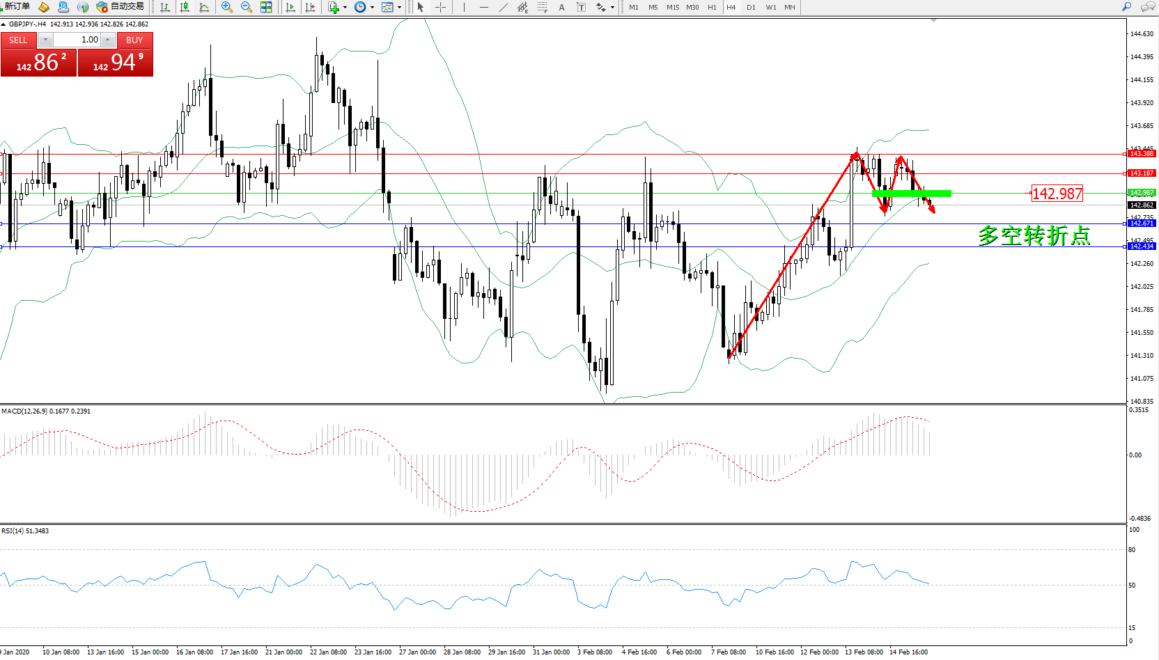 备选策略:142.987上方看涨,目标143.187、143.388