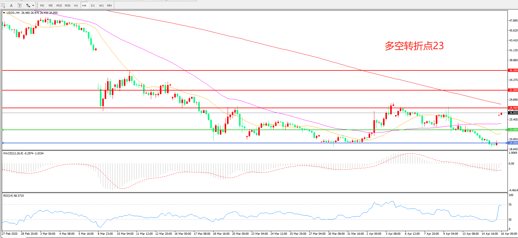 4小时图看,油价跳空高开,低迷状况有所缓解,20美元成为短期支撑,28美元成为上方阻力, MACD绿柱缩短,RSI指标走平,日内延续震荡概率较大。
