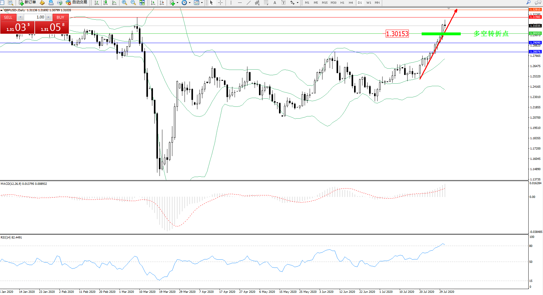 交易策略:1.30153上方看涨,目标1.31990、1.32810