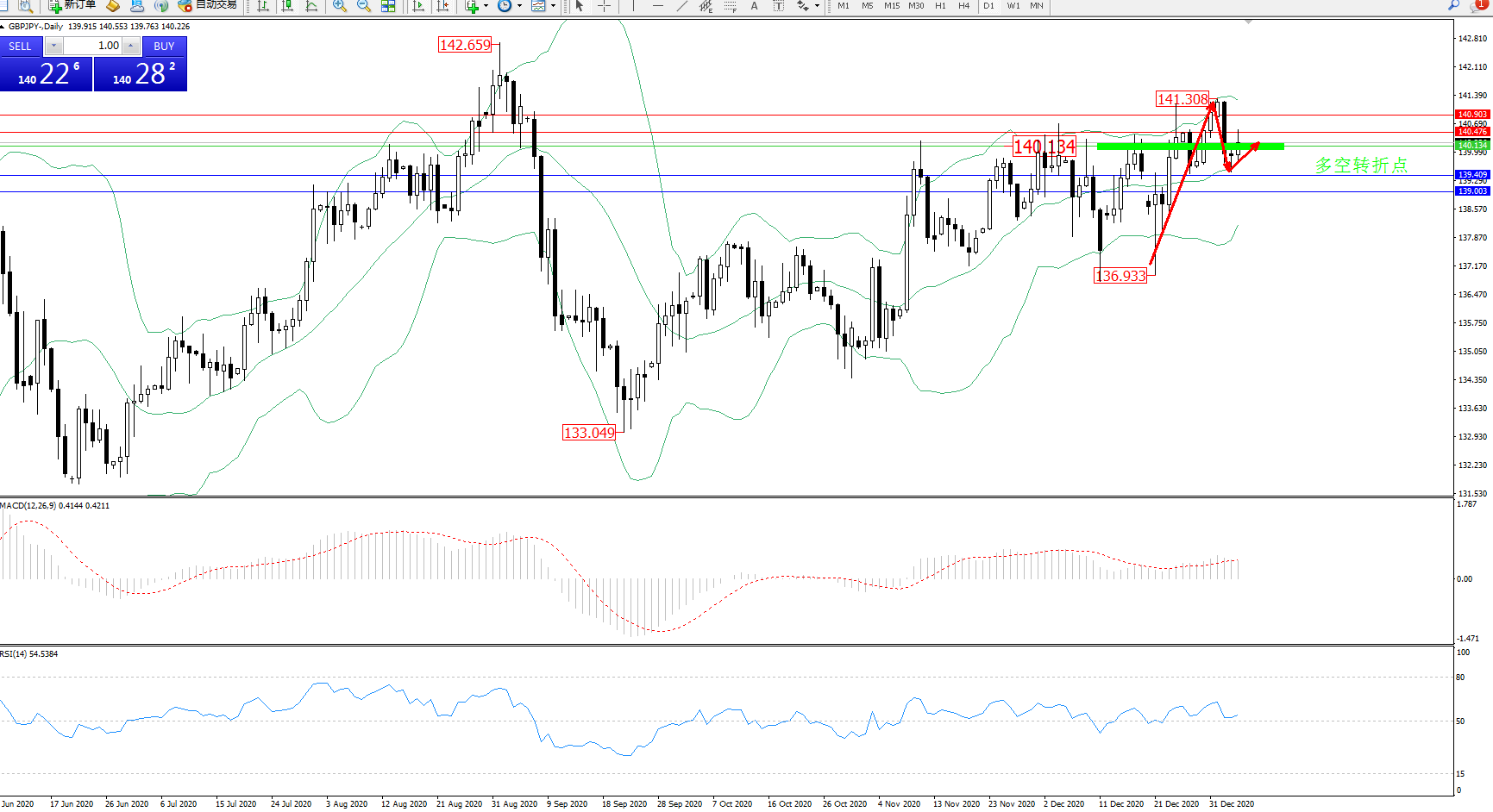 交易策略:140.134上方看涨,目标140.476、140.903