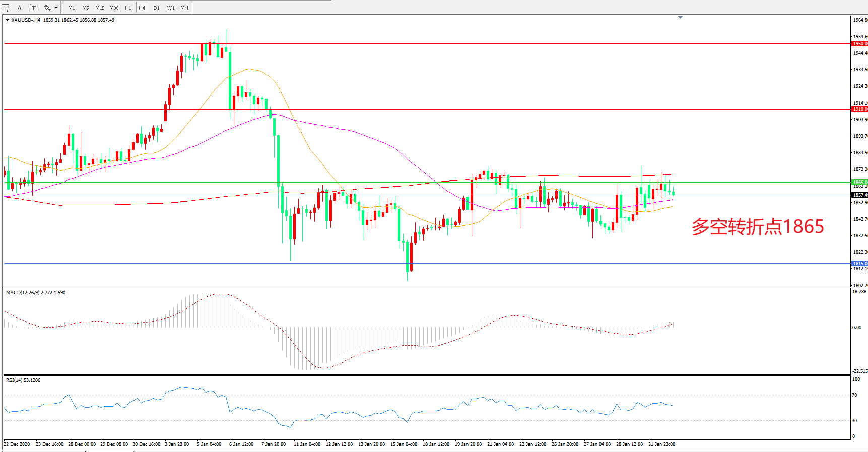 交易策略:在1865.00之下看跌,目标1815.00    1765.00