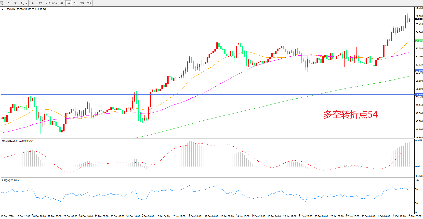 4小时图看,油价连续拉升,整体表现偏强,54一线被突破后快速上行,多头趋势正在形成,MACD红柱增加,RSI指标向上,日内延续上行概率较大。