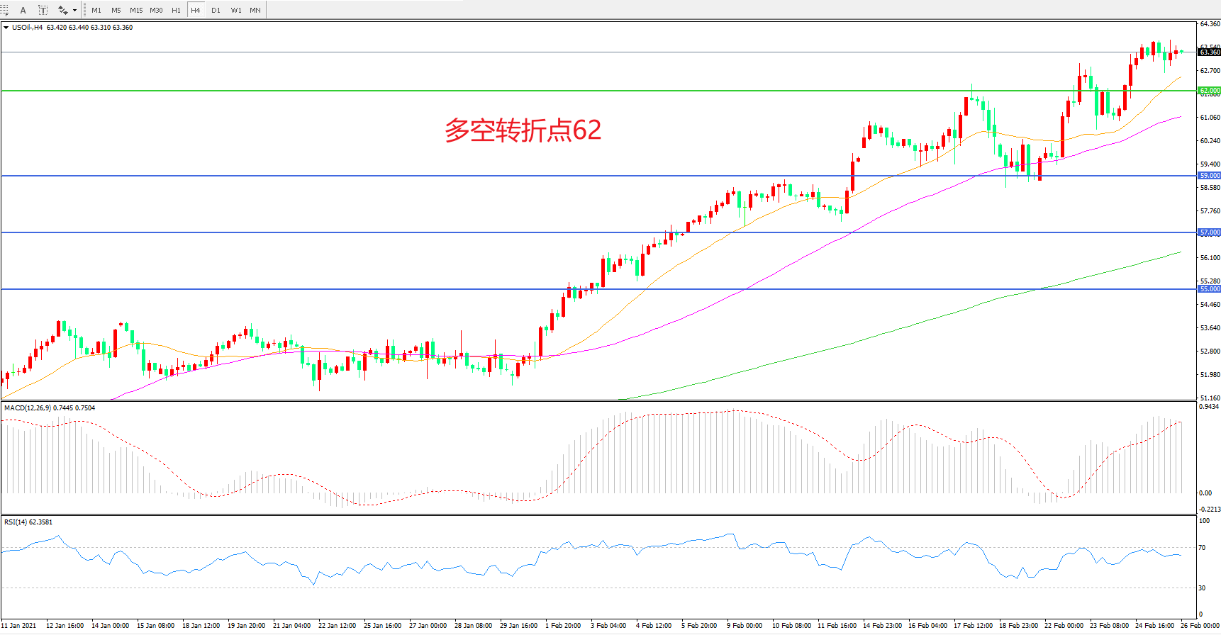 交易策略:在62.00之上看涨,目标65.00 68.00