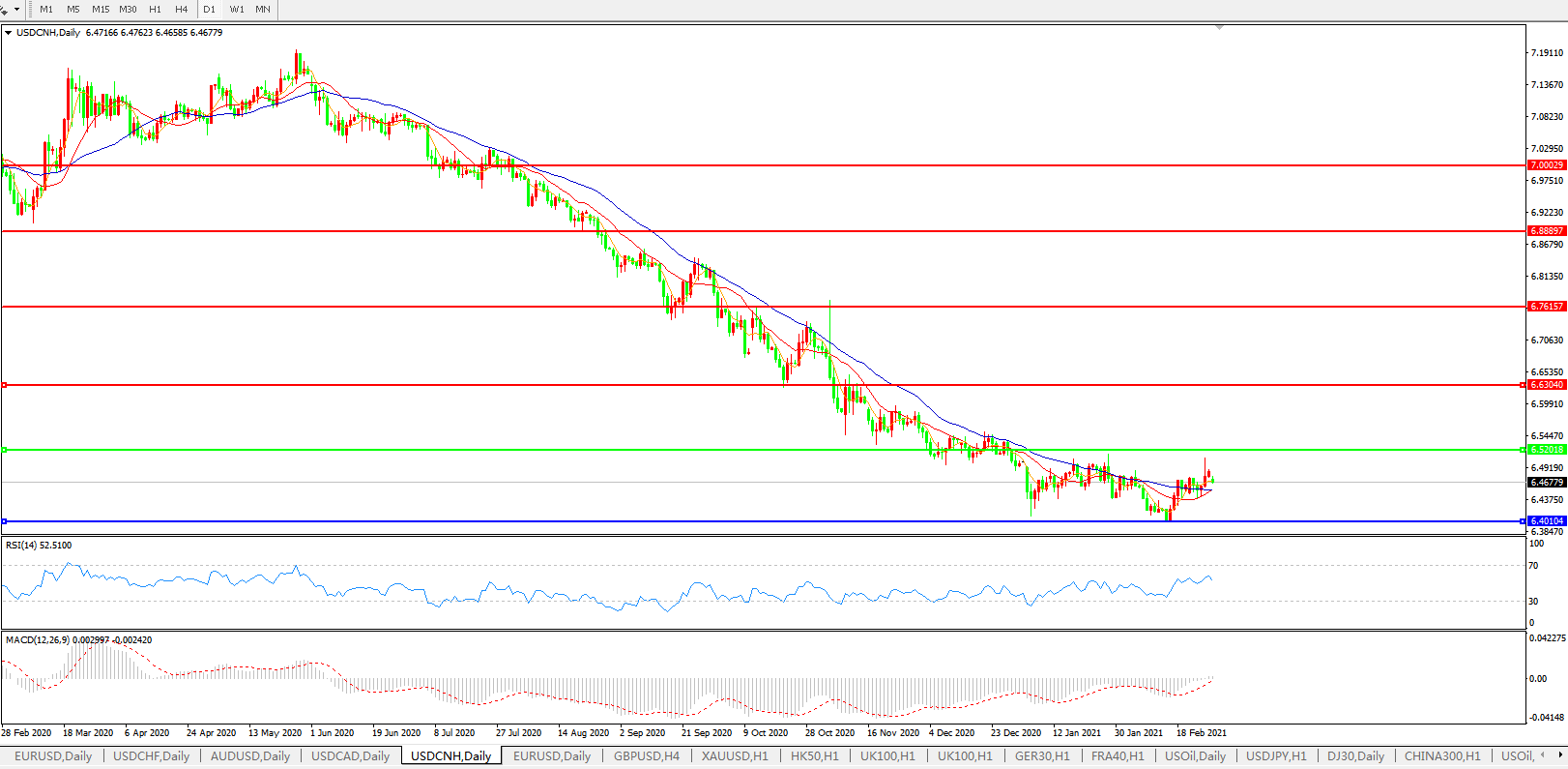 备选策略: 在6.5200之上,看涨,目标价位为6.6300,然后为6.7615。