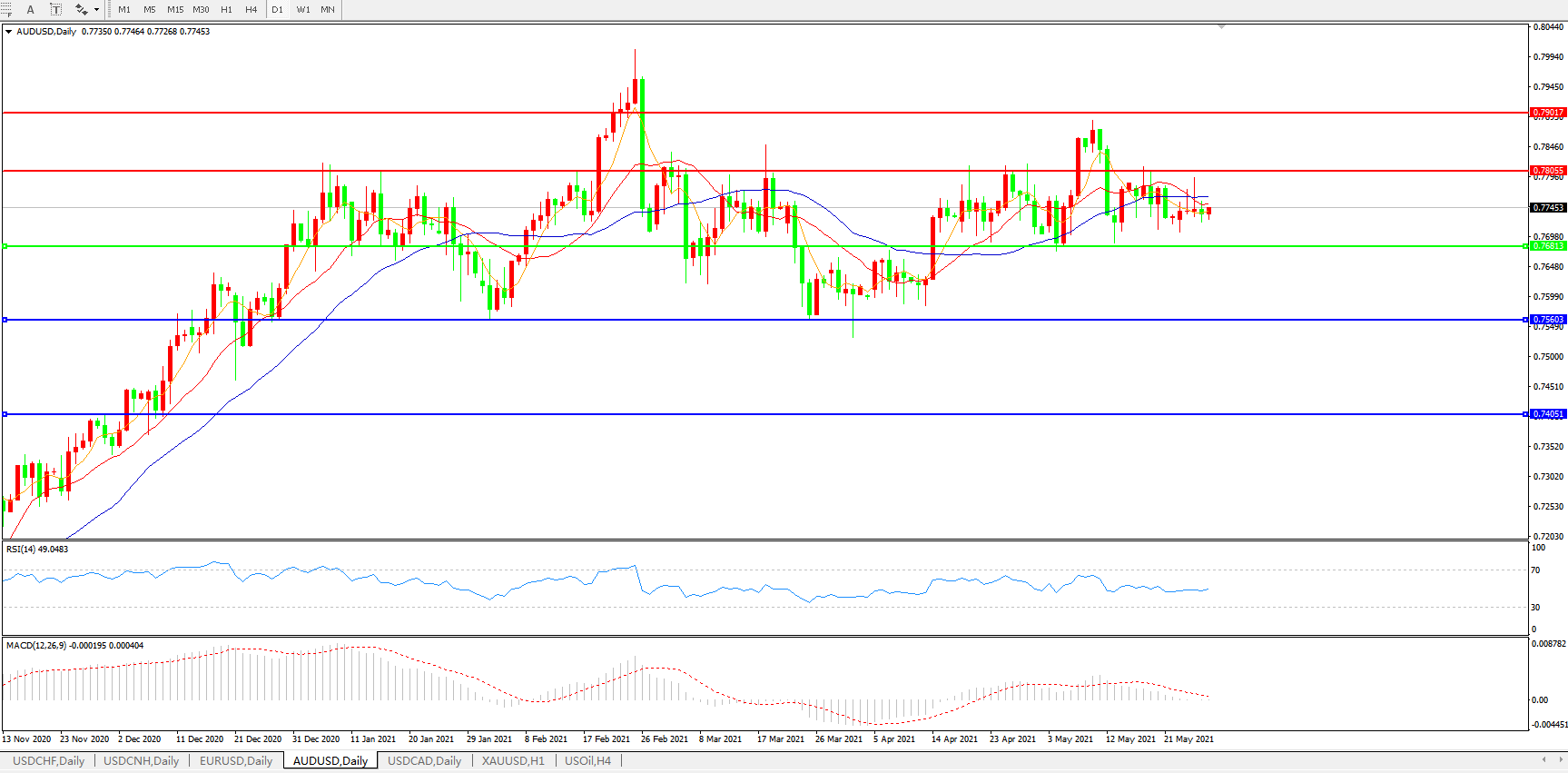 备选策略:0.7680下方看跌,目标0.7560、0.7400