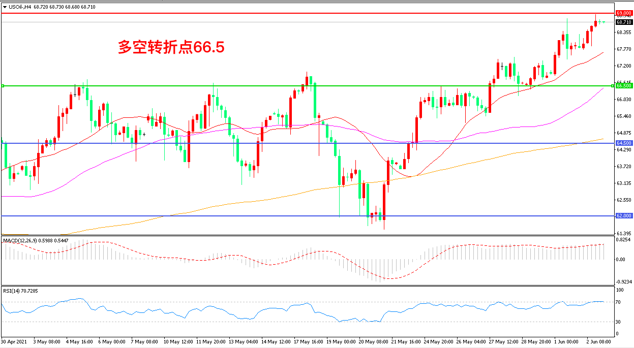 交易策略:在66.50之上看涨,目标69.00 72.00
