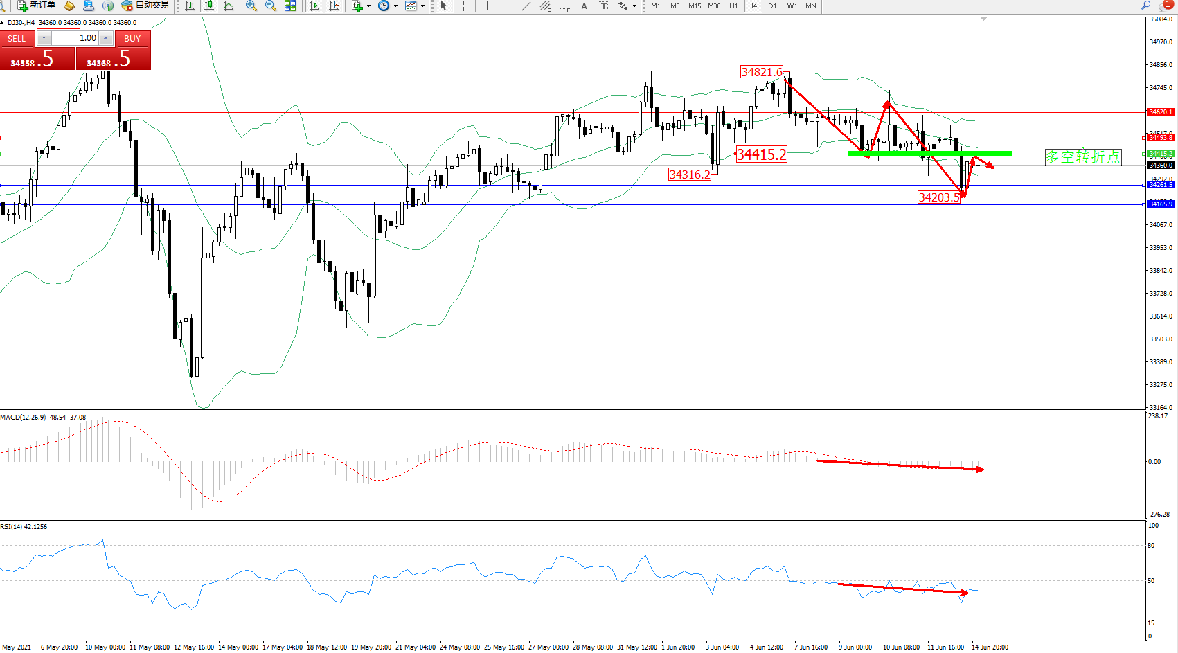 道琼斯指数DJ30——4小时K线图显示:
