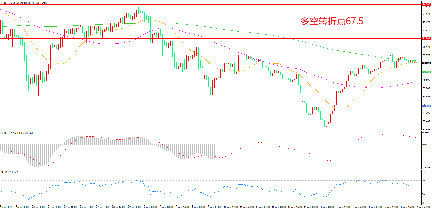 交易策略:在67.50之上看涨,目标71.00 74.50