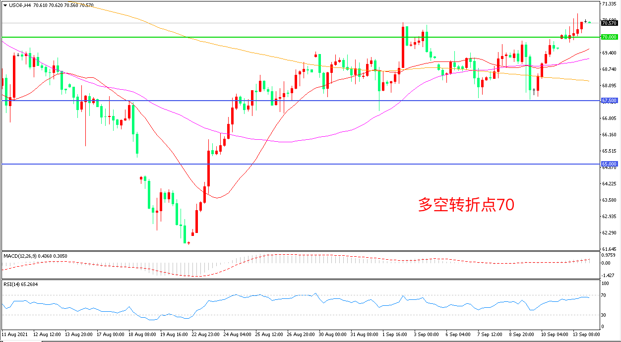 4小时图看,油价以70美元为依托震荡上行,短期走势有所回暖,均线系统逐渐发散,MACD红柱增加,RSI指标走平,日内震荡上行概率较大。