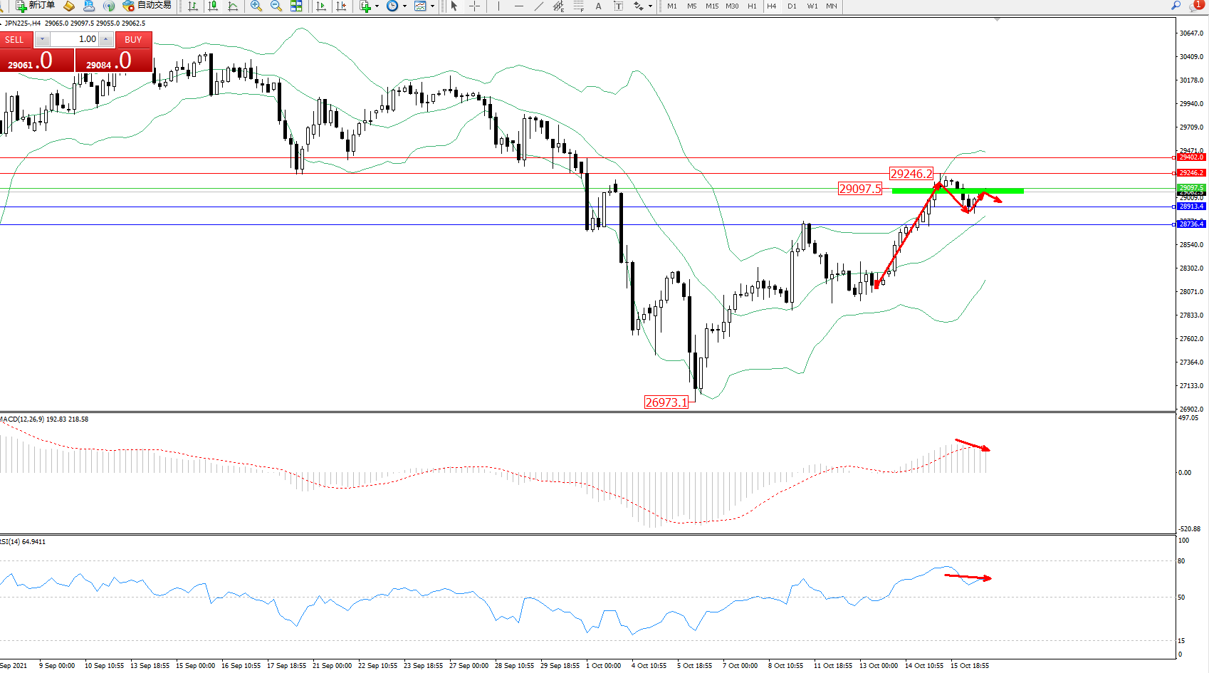 技术点评:多头动力延续布林带指标通道中上轨区间持续震荡上扬,高位抵达29246位置后短暂整理调整,多头动力有继续攀升迹象,布林带指标呈收口走势,MACD指标处于多头区域维持整理平移中,RSI指标处于多头区域维持弱势平移中;