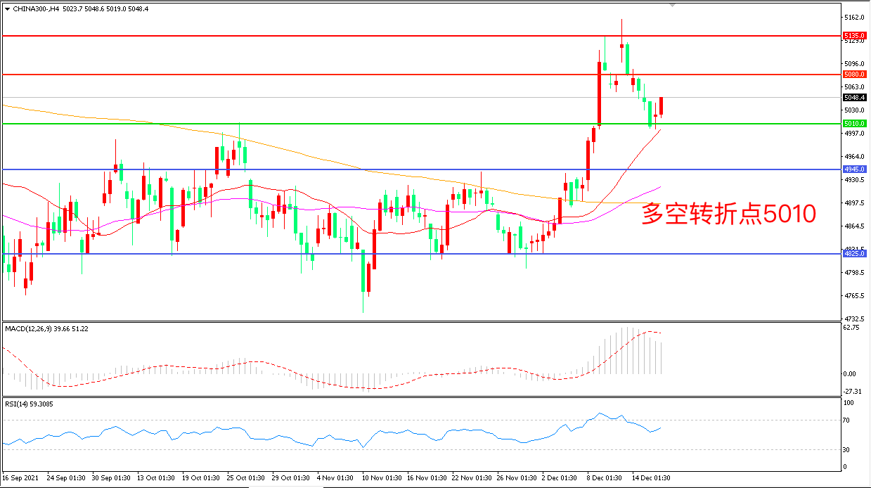 4小时图看,沪深300回踩21周期均线后震荡反弹,短期走势回暖,但5010成为多空分水岭,MACD红柱缩短,RSI指标走平,日内震荡上行概率较大。