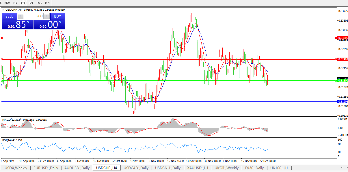 交易策略:0.9180下方看跌,目标0.9120、0.9040