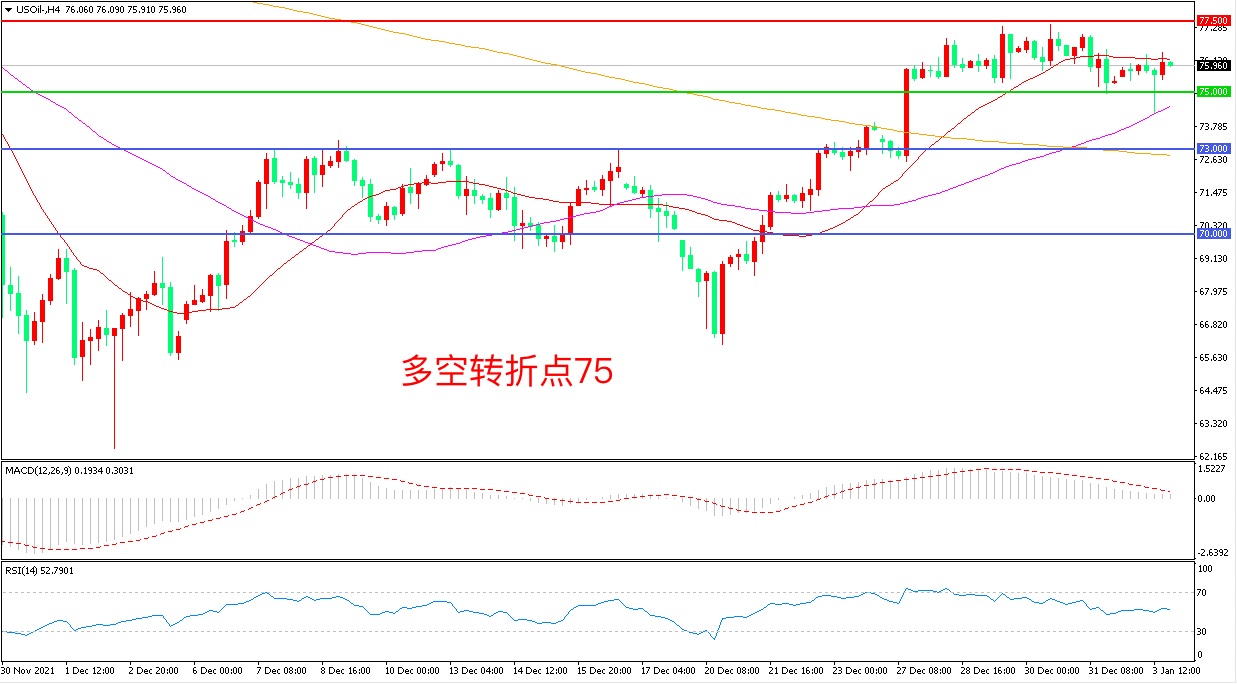 周一(1月3日),投资者聚焦本周二召开的OPEC+产油会议,美国WTI原油延续高位震荡,收报75.96美元/桶。多名知情人士透露OPEC+将维持2月增产40万桶/日的计划,并表示奥密克戎毒株对需求的影响温和而短暂,风险偏好回升的氛围下,油价有望延续过去一年的强势表现。
