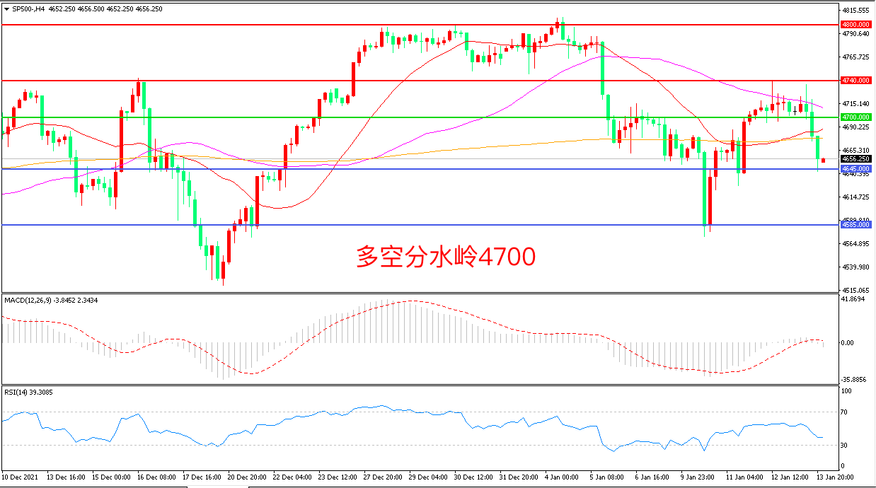 4小时图看,标普500触碰4740后再度回落,取决真的急需明显,4700成为多空分水岭,55周期均线成为上方阻力,MACD红柱缩短,RSI指标走平,日内震荡下行概率较大。