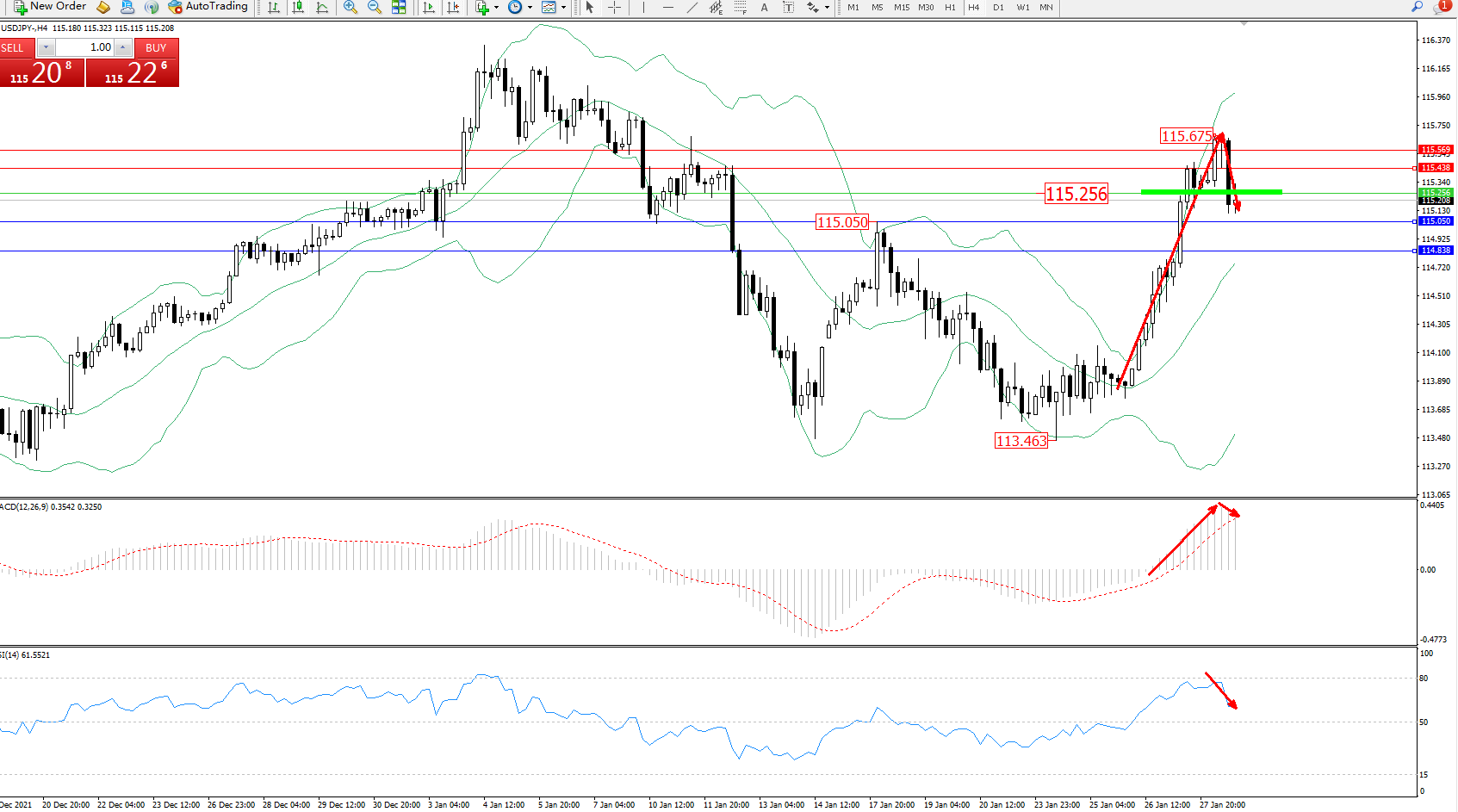交易策略:115.256下方看跌,目标115.050、114.838