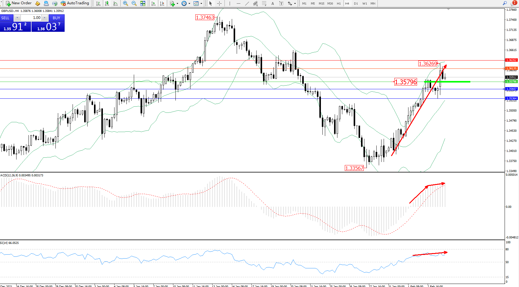 交易策略:1.35796上方看涨,目标1.36135、1.36352