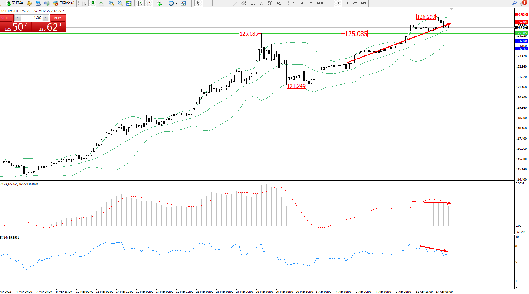交易策略:125.085上方看涨,目标125.908、126.440