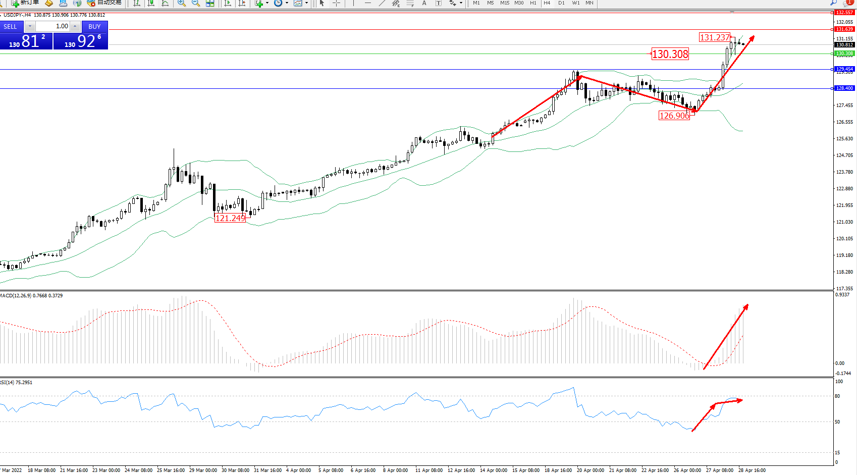 技术点评:多头动力延续布林带指标通道持续震荡上扬,高位处于上轨附近节点131.237位置后徘徊,多头有继续上扬态势,布林带指标呈张口走势持续中,MACD指标处于多头区域强势拉升上扬,RSI指标处于多头区域维持震荡上移至超买区80均衡线下侧徘徊;