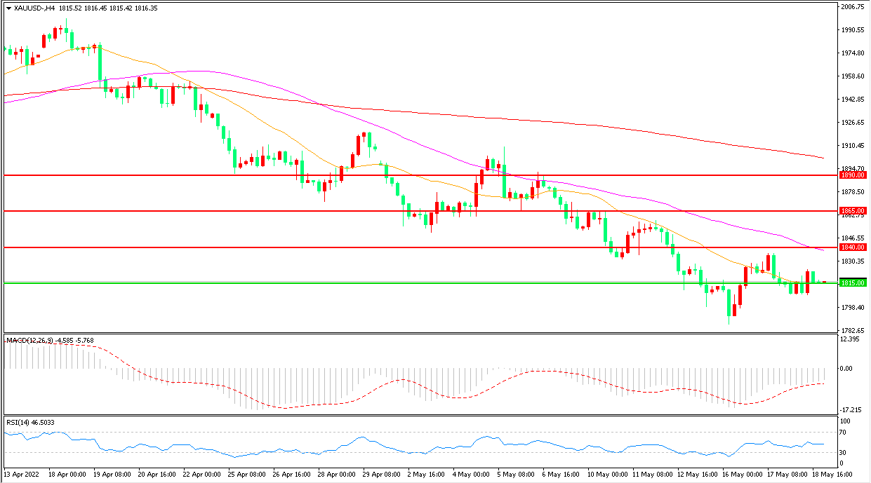 周三(5月18日),市场评估多位美联储官员的鹰派发言以及经济增长前景,美元和美债被避险需求推涨,现货黄金延续震荡形态,收报1815.52美元/盎司。随着美联储官员继续释放偏鹰信号,美元对金价的压制仍在持续,多重利空因素的共振下,金价延续低位震荡概率较大。