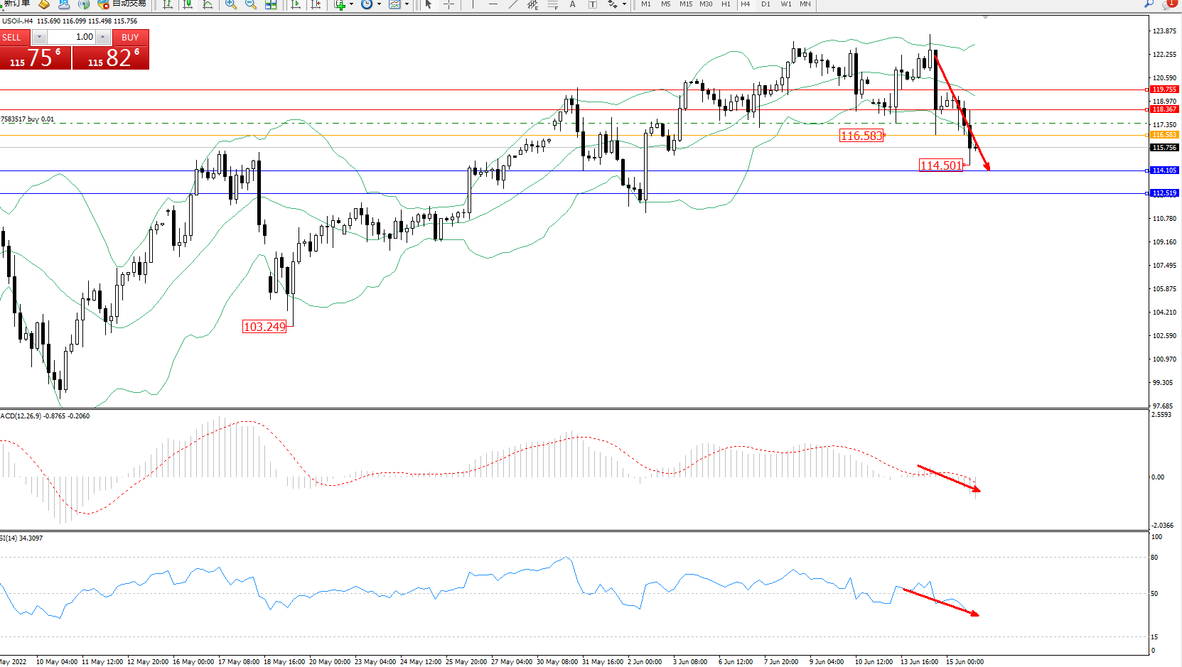 交易策略:在116.583下方看跌,目标114.105、112.519
