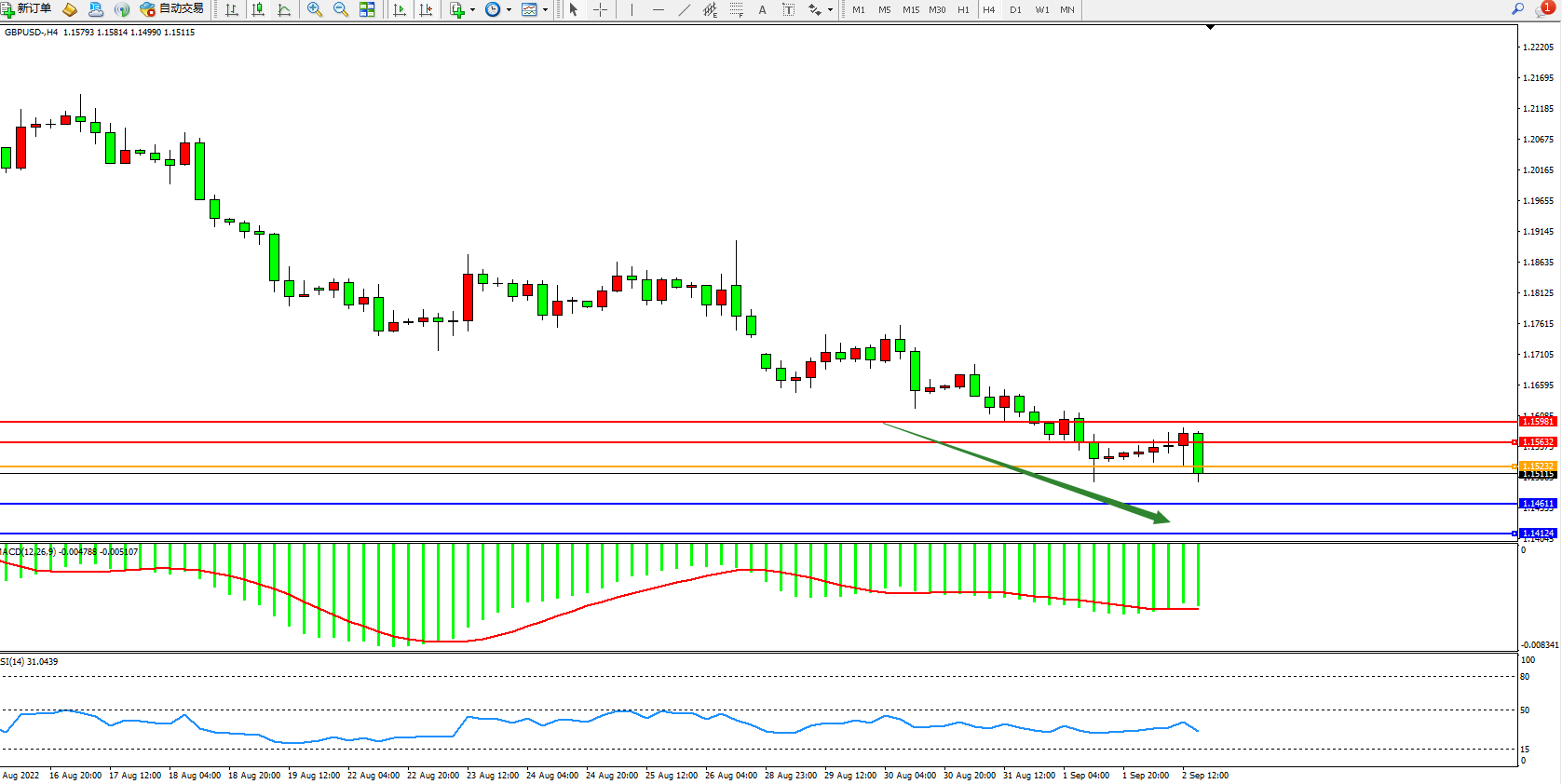 交易策略:1.15232下方看跌,目标1.14611、1.14124