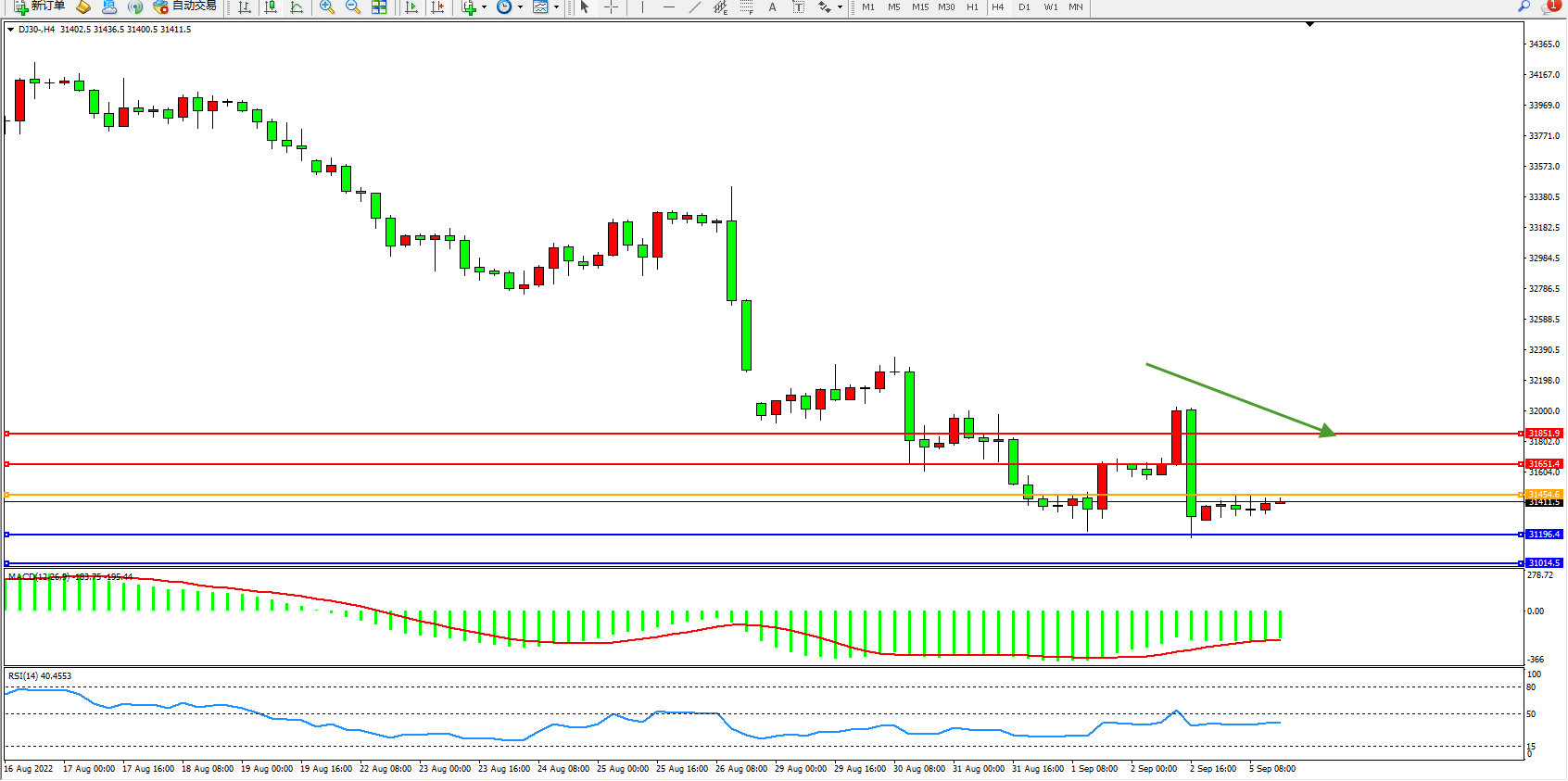 道琼斯指数DJ30——4小时K线图显示: