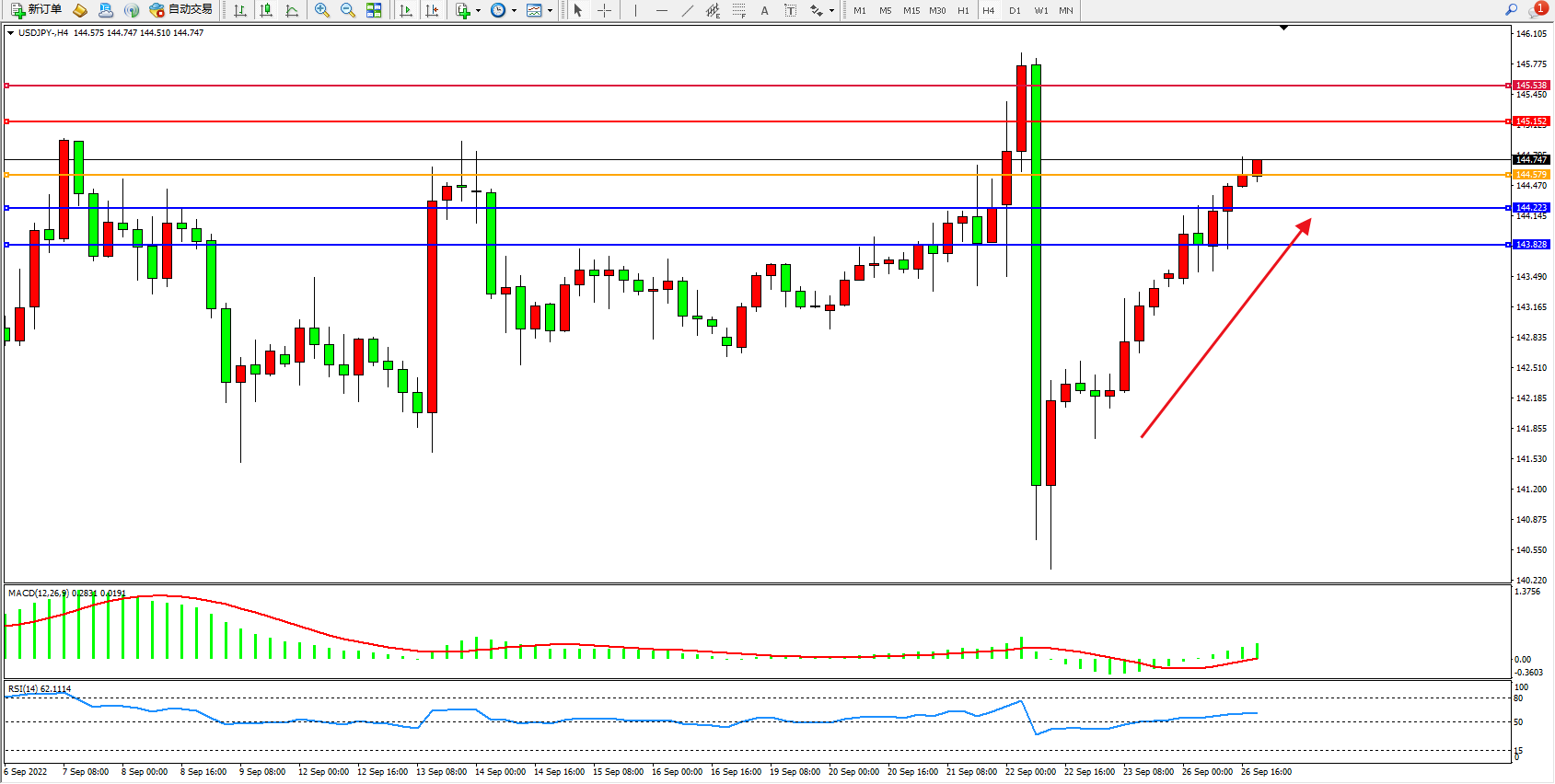 美元日圆USDJPY——4小时K线图显示: