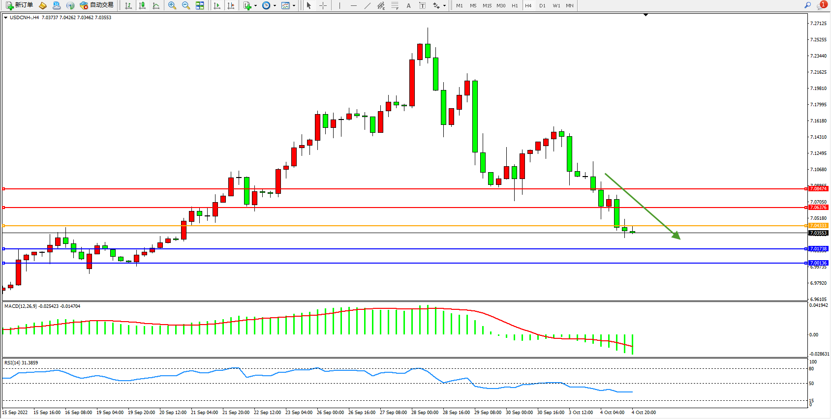 美元人民币USDCNH——4小时K线图显示: