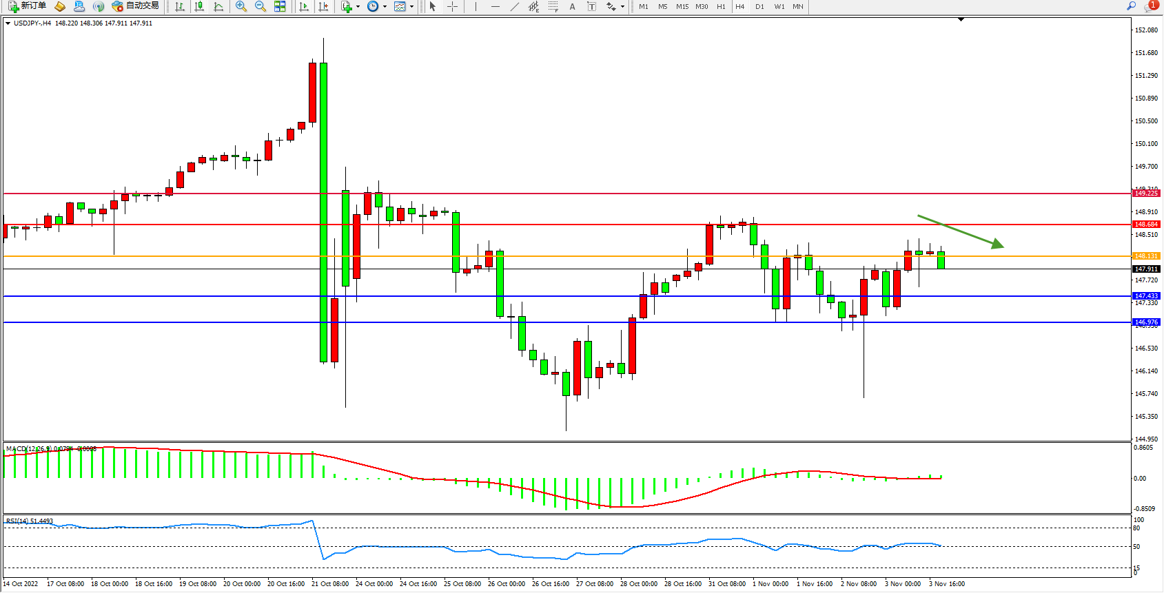 美元兑日圆维持147.911附近震荡,在美联储收紧货币政策以及日本央行宽松货币政策鲜明对比下,美元/日大幅上行,在货币政策差异这一根本驱动因素持续作用下,美元/日走势上仍以看涨为主,只是要提防日本央行的干预。