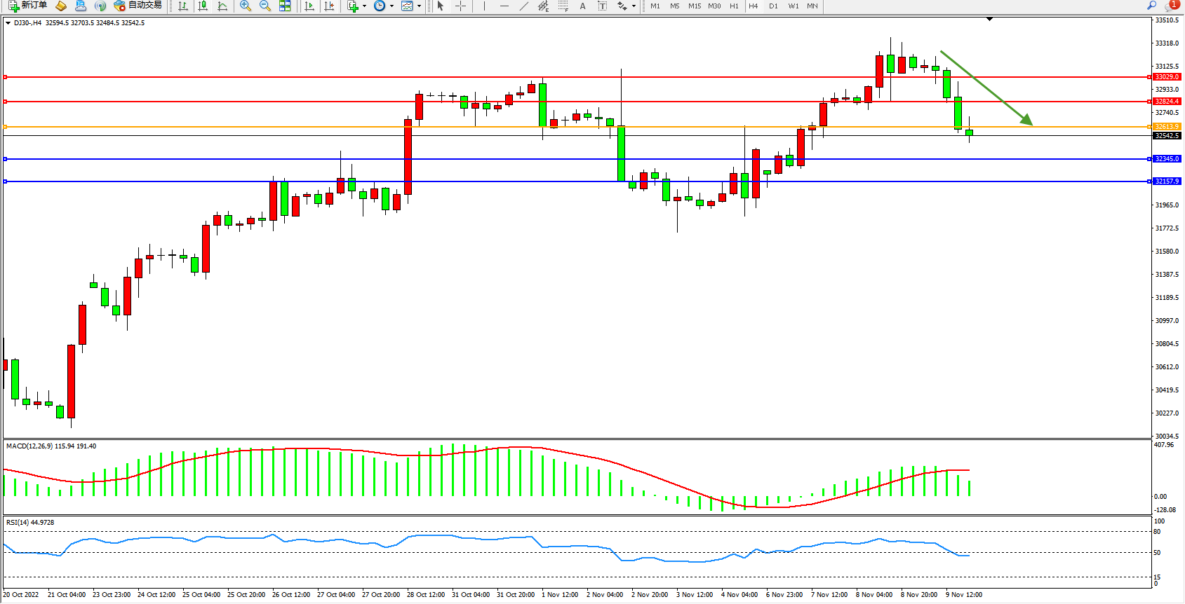 道琼斯指数DJ30——4小时K线图显示: