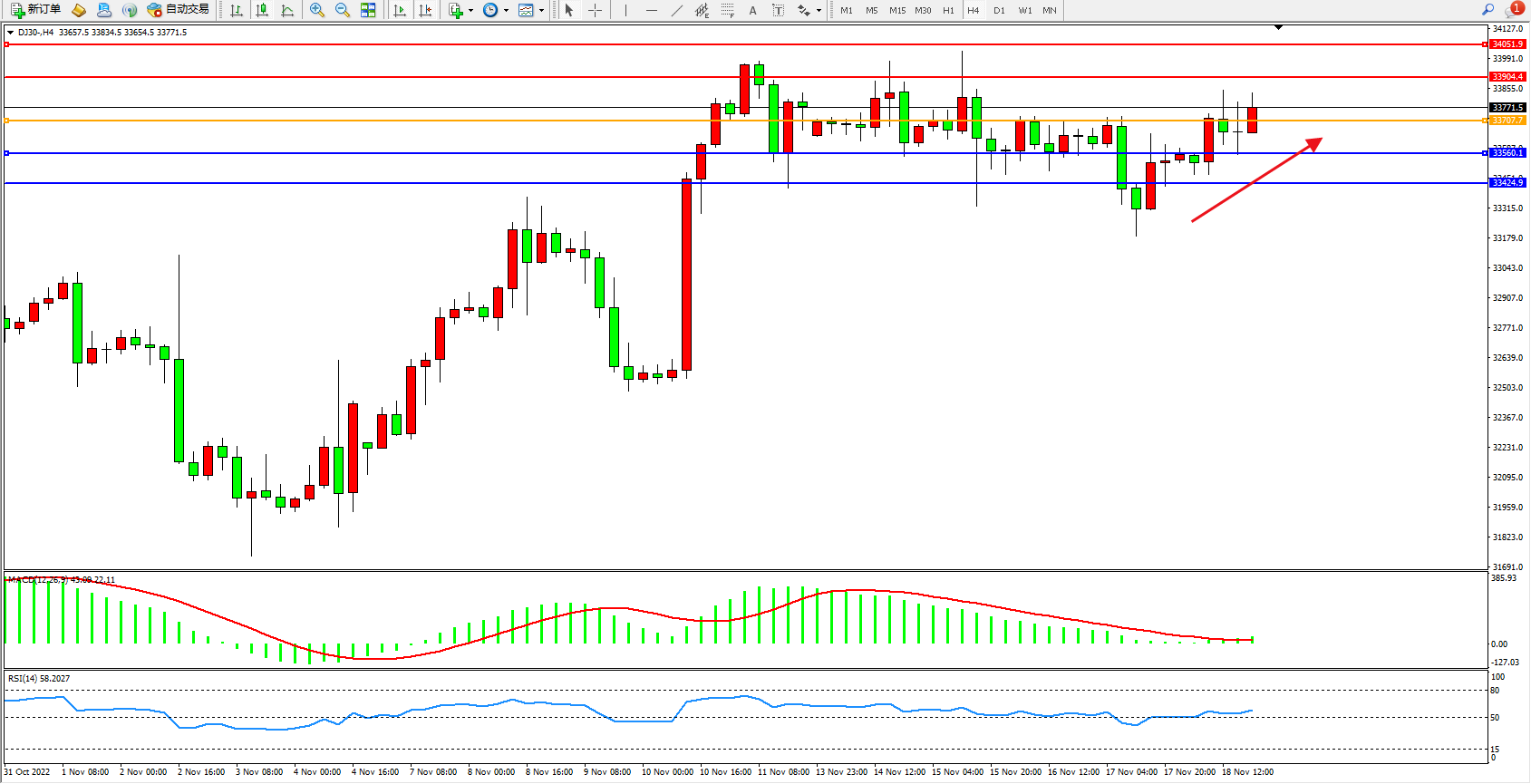 道琼斯指数DJ30——4小时K线图显示: