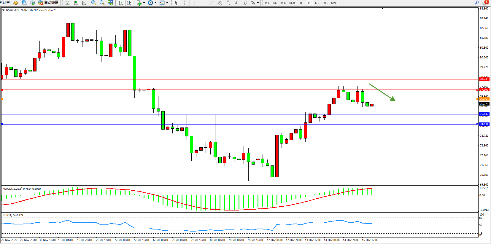 交易策略:76.653下方看跌,目标75.442、74.634