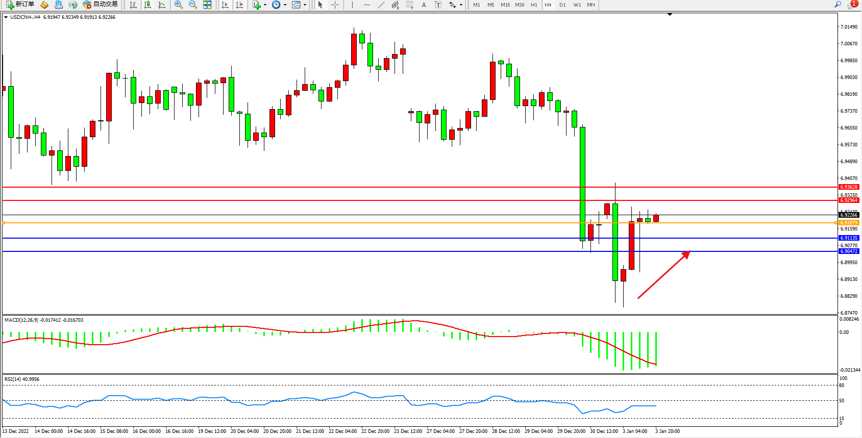 交易策略:6.91879上方看涨,目标6.92964、6.93628