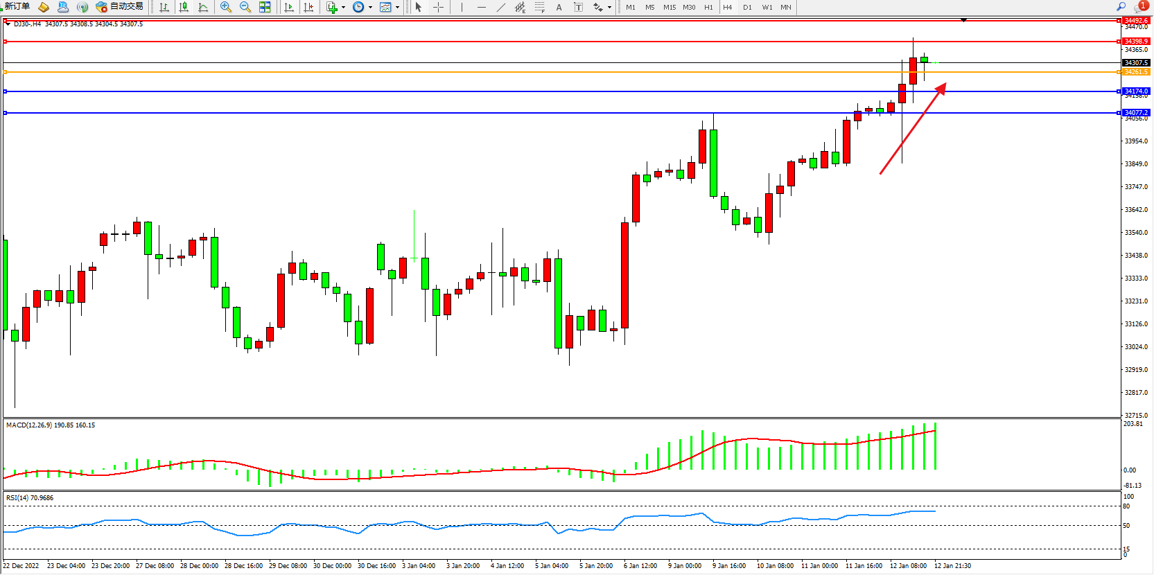 道琼斯指数DJ30——4小时K线图显示: