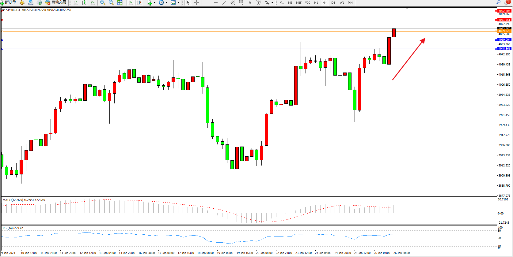 标普500指数1月26日(周四)收盘上涨44.21点,涨幅1.1%,报4060.43点;美国至1月21日当周初请失业金人数录得18.6万人,为2022年4月23日当周以来新低,失业工人发现,找一份新工作比申请政府福利要容易得多。这在一定程度上说明,在一个物价和工资都在上涨的世界里,政府救济金发放速度停滞不前。