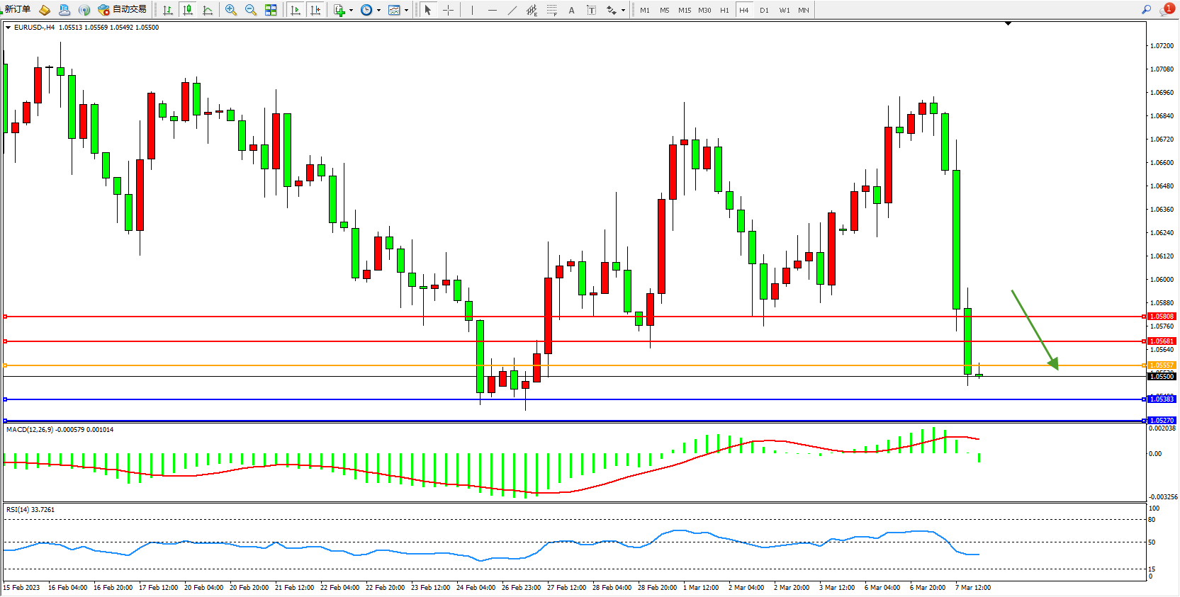 交易策略:1.05557下方看跌,目标1.05681 1.05808