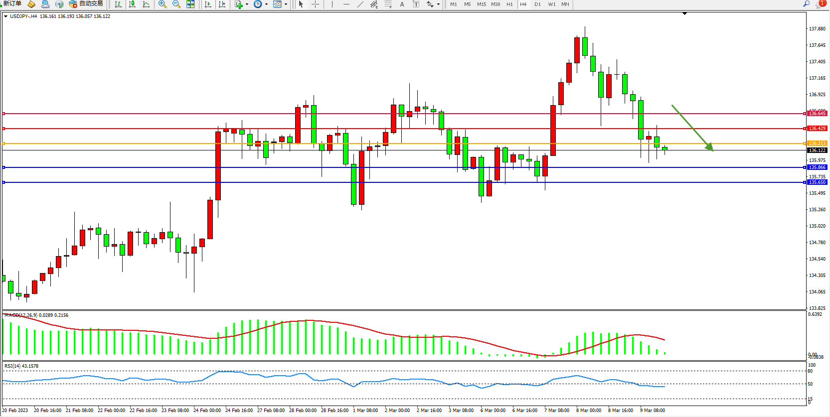 交易策略:136.213下方看跌,目标135.866 135.650